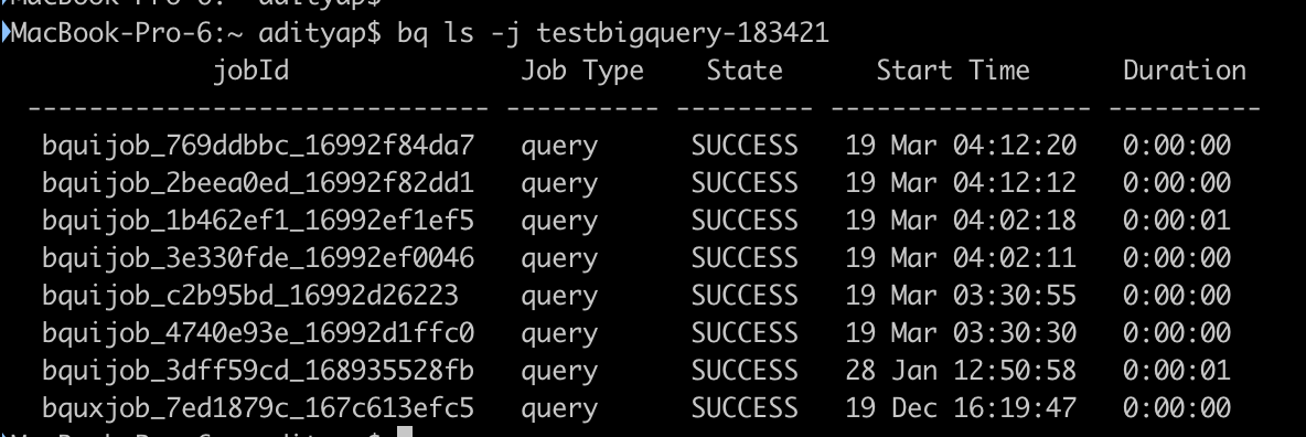 bq ls -j <project_name> This command will list all the audit logs for a particular BigQuery Project.